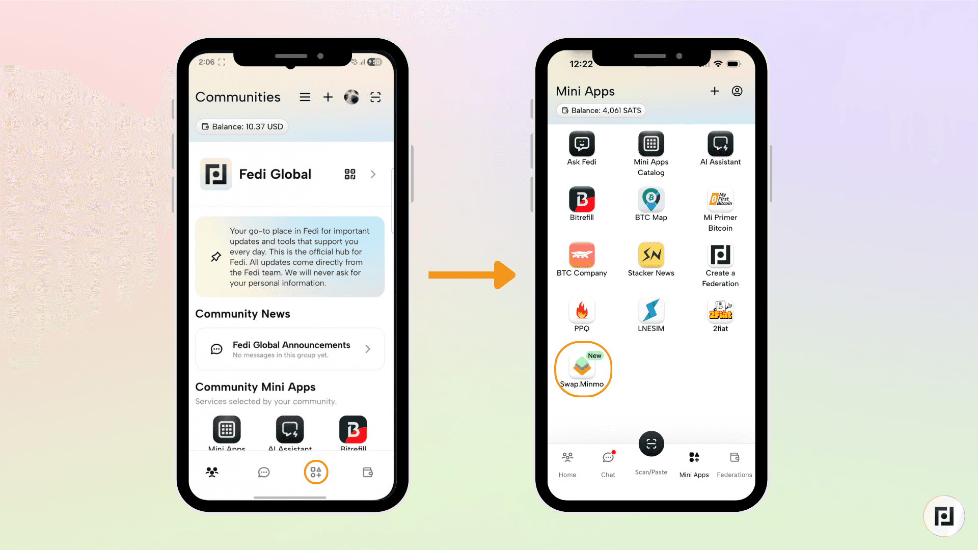 Step 1: Tap the Mini Apps button at the bottom-right of your Fedi screen.