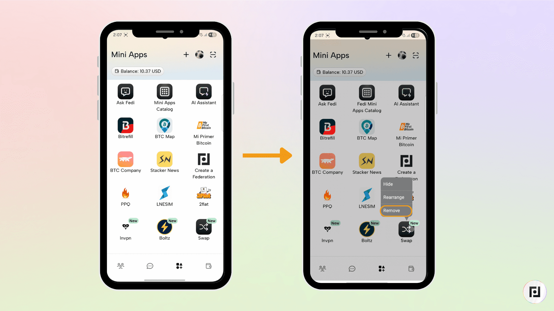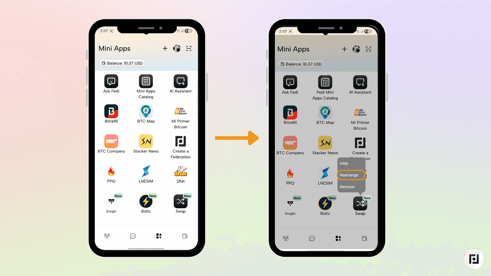 We’ve introduced new updates to the Mini Apps experience! Now you can rearrange your Mini Apps to match how you use your favorite web apps, and we've made it easier to add and remove Mini Apps to further personalize your space on Fedi. This release also includes UI improvements on Mini Apps and bug fixes across the app.