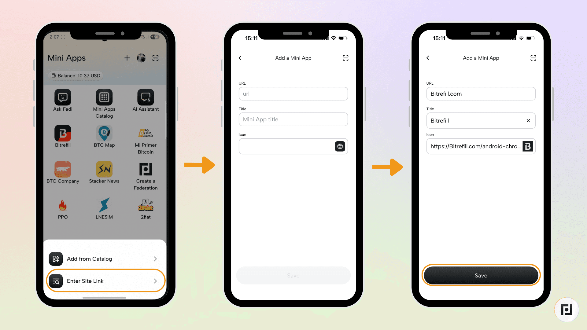 With “Enter Site Link”, you can type the URL of the website you’d like to add as a Mini App. The name and logo of the Mini App autopopulate. You can change the name and logo to further customize the Mini App. Once you’ve added the URL, click “Save”.