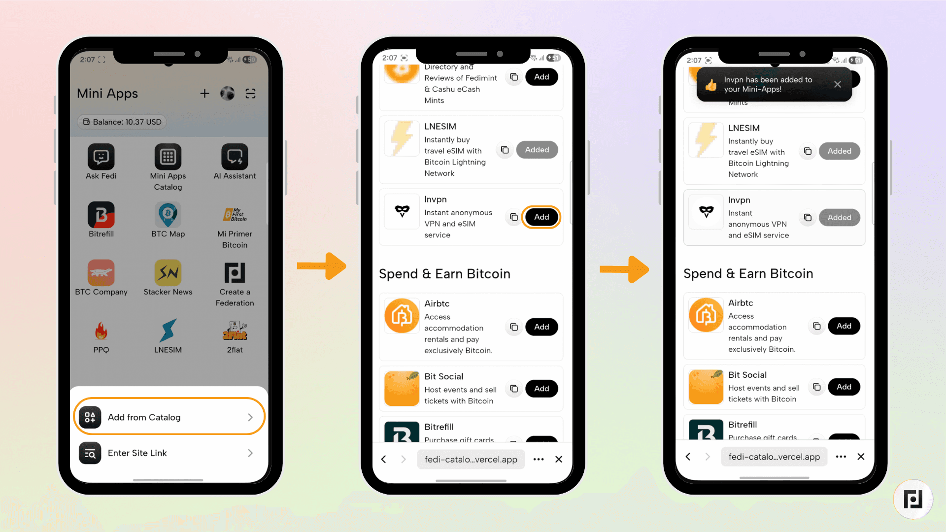 With “Add from Catalog”, you can browse through the Fedi Mini App Catalog and click the “Add” button next to the Mini App of your choice. The Mini App gets automatically added to your list of personal Mini Apps.