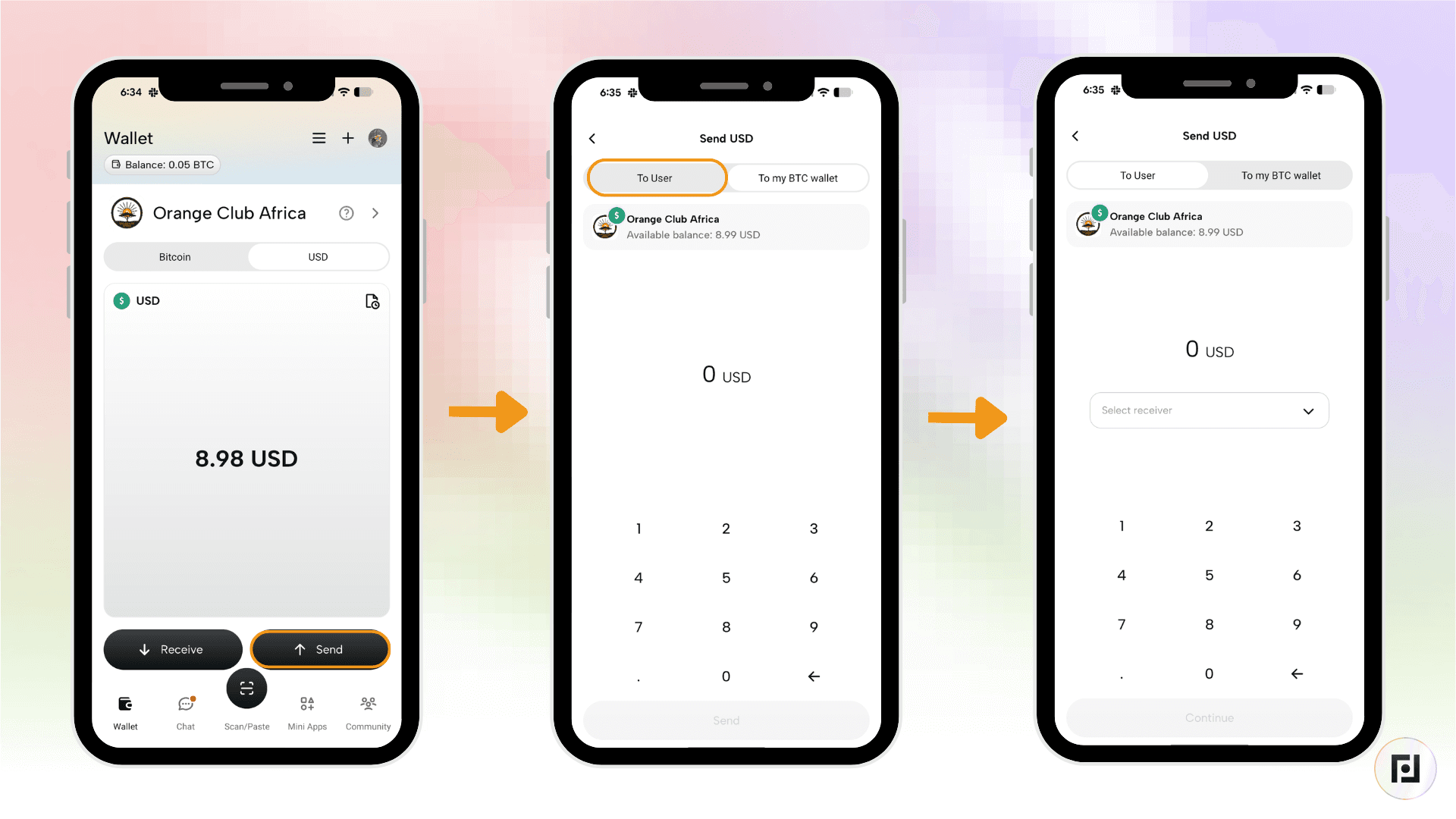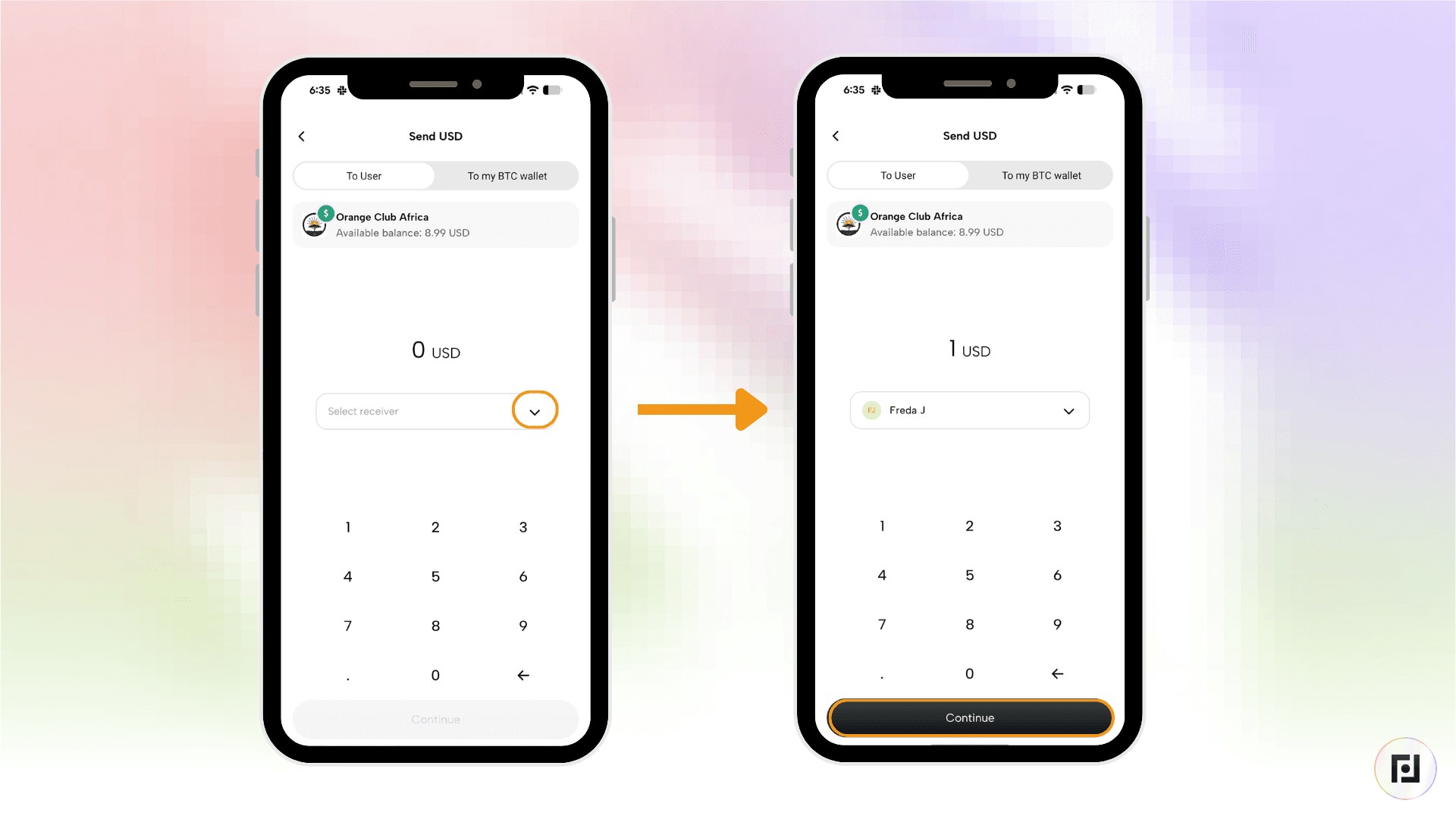 Step 4: Click the bar with the “Select receiver” text inside and either select who you’d like to send to from your contacts or input the user you’d like to pay. You can scan a user’s QR code to add them. Enter the amount and click on “Continue”.