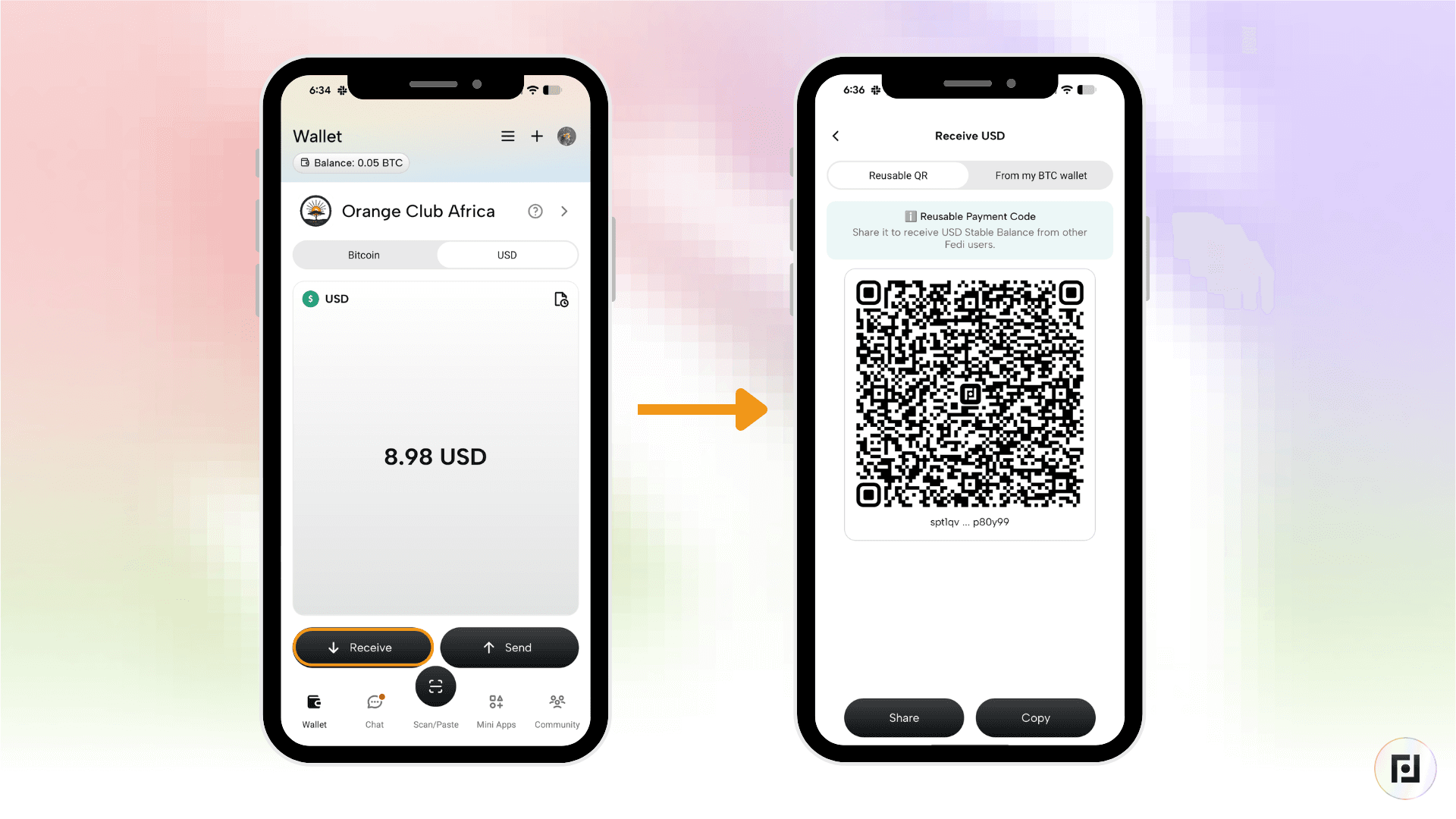 Step 2: Click the “Receive” button. This will reveal a “Reusable QR”. Click “Share” or “Copy” and then proceed to share the QR code with your contact.